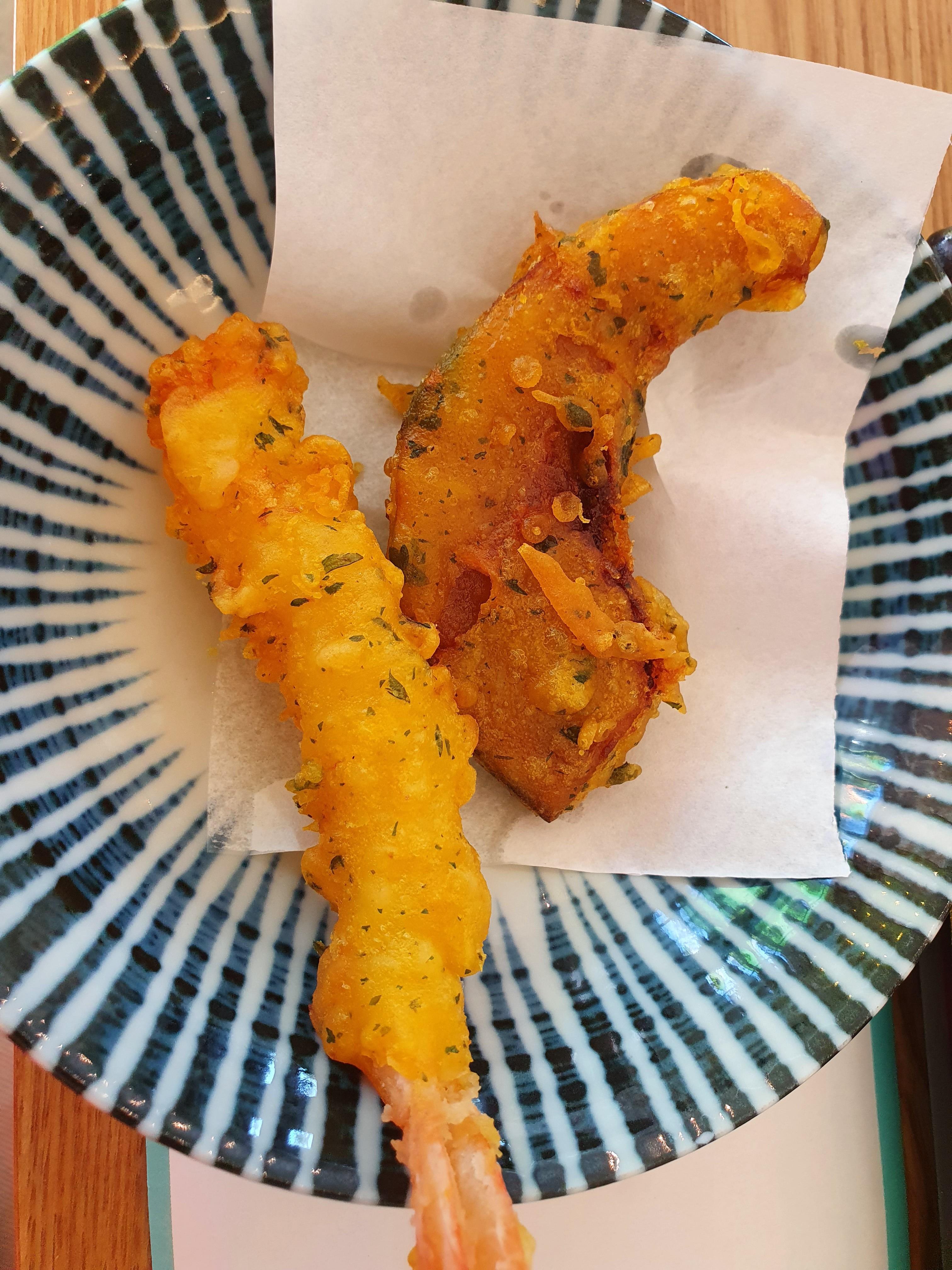 튀김으로는 새우튀김이랑 단호박 튀김이 나왔는데