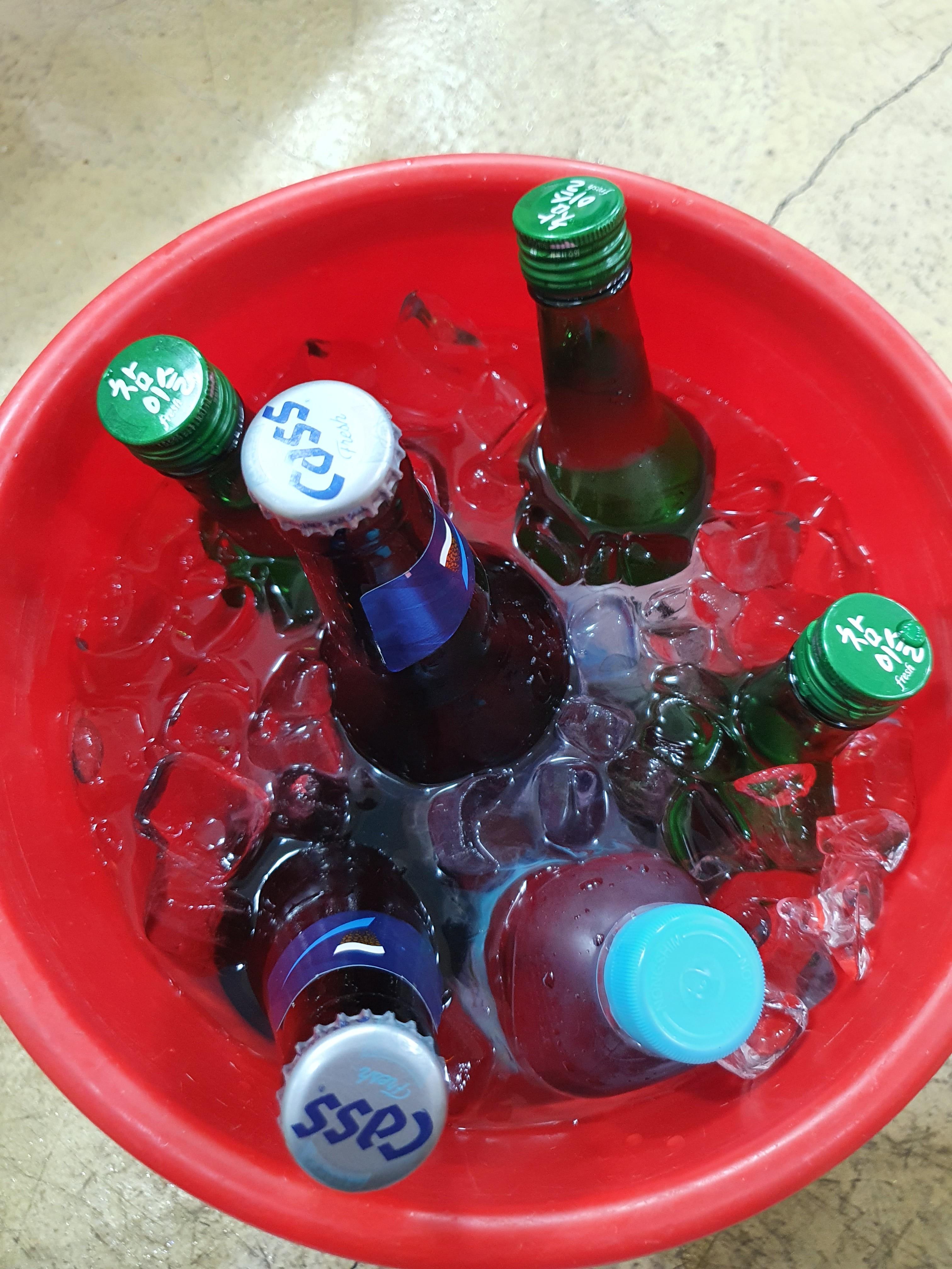 테이블 옆에 이렇게 얼음이 담겨 있는 양동이가 있더라구요.